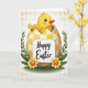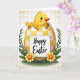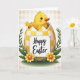 This card features a fluffy yellow chick with a faint blush on its cheeks, peeking out from a large cracked eggshell as if greeting a close friend with a shy, eager look 🐰. The eggshell sits at the center and has a gentle checkered pattern in warm gold and creamy white, like a cozy cradle around the little bird. A white banner stretches across the upper middle, held in place with small round studs, and the message is written in flowing dark lettering that stands out clearly. On both sides, deep green leafy sprigs curve inward, framing the chick the way two companions might lean closer in a shared moment. Near the bottom, two bright yellow flowers with orange centers echo the chick’s color, adding a soft, affectionate warmth to the scene 🌷. Behind everything, a pale background shows a subtle diamond motif that keeps the focus on the central figure without feeling busy. The lighting is gentle and rounded, giving the chick’s eyes a glossy highlight and the shell edges a soft shadow. Fine details like the delicate leaf veins and the jagged shell cracks are visible against the creamy patterned backdrop.