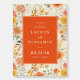 This wedding poster features a vibrant floral pattern with warm tones of orange, peach, yellow, and cream, creating an inviting garden-like atmosphere. The central coral block highlights elegant serif typography, offering customizable space for names and details, while the overall design exudes a romantic and vintage charm perfect for celebrating love. Ideal for adding a touch of sophistication to any wedding event, this poster combines artistic brush strokes with a cheerful mood, making it a delightful addition to your special day.