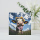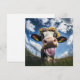 A playful, close-up image of a cow standing in a sunny meadow, adorned with a vibrant floral crown made of daisies and wildflowers. The cow is sticking its tongue out, adding a touch of humor and charm to the scene. The bright blue sky and soft clouds in the background further enhance the joyful and whimsical feel of the image.