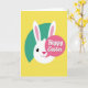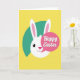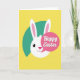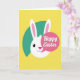 This card features a white, long-eared bunny head centered on a bright yellow background, drawn with smooth shapes and a friendly, tender look that feels like a quiet hello between close friends 🐰. A deep teal arc curves behind the bunny like a simple backdrop, helping the face stand out. The tall ears have soft pink inner details that match the small pink nose. One dark eye and a gentle curved mouth keep the expression calm and welcoming. To the bunny’s right, a rounded pink speech bubble floats outward, as if the bunny is speaking to someone just off the card. Inside the bubble, the words “Happy Easter” appear in white lettering, centered and easy to read 🌷. The overall scene is uncluttered, with the teal arc sitting low behind the bunny and the pink speech bubble angled slightly toward the upper right.
