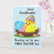 This design shows a cheerful yellow baby bird popping up from a cracked eggshell, its round black eyes and rosy cheeks giving it a tender, friendly look 🐰. The shell sits in a twig-woven nest, like a cozy little home, and the bird’s tiny open beak makes it seem like it’s happily greeting someone close by. One half of the shell is bright blue with small white snowflake shapes, while the other half is soft pink with tiny gold star shapes, creating a sweet mix of seasons. A small cone party hat perches on the bird’s head, striped in hot pink, sky blue, and golden yellow for a festive touch. Below, the nest rests on green grass dotted with small pink and blue flowers 🌷. Near the top, a short greeting appears in a flowing handwritten-style font, set in a dark color that stands out against the pastel blue background. The background stays a calm light blue, while the shell’s blue-and-pink halves and the scattered blossoms add little pops of color around the nest.