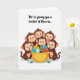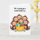 This greeting card shows six cute, human-like primate characters in soft, rounded shapes and deep chocolate-brown tones, gathered closely with wide smiles and big, shining eyes that seem to meet each other with friendly, affectionate attention ❤️. They cluster around a sunny yellow woven basket placed front and center, making the scene feel like a shared gift between close companions. Two of the characters hold the basket from the front while others lean in over the rim, their small hands and curious faces angled toward the flowers as if admiring them together. The basket is filled with fresh-looking blooms in bright blue, yellow, red, white, and leafy green, creating a cheerful contrast against the plain white background 🌼. A few green leaves are scattered near the base of the basket, adding a grounded, natural touch. Near the top, the phrase “We’re giving you a basket of Flowers...” appears in dark lettering, centered above the group and easy to read. The composition keeps all attention on the shared offering, with the characters’ close spacing and gentle poses suggesting closeness and care. The yellow basket has a woven texture, and the flower petals are layered in small clusters with pops of blue and red near the top edge.