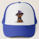 Colorful illustration of a happy dog sporting a purple witch hat, embodying the Halloween spirit. Ideal for seasonal designs, pet-related promotions, or whimsical holiday decorations.