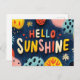 This vibrant and playful image features the phrase "HELLO SUNSHINE" in a hand-drawn, multi-colored font. The typography is set against a dark blue background filled with a variety of brightly colored abstract shapes and patterns. The overall design has a textured, artistic feel that combines bold colors and whimsical doodles to create a cheerful and positive greeting.