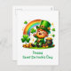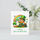 This vibrant Saint Patrick's Day greeting postcard features a cartoon-style leprechaun radiating joy and festivity. With his green hat and a shamrock, he stands against a backdrop of a colorful rainbow leading to a pot of gold. Perfect for capturing the spirit of Irish culture and celebration.