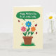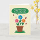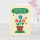 This card features a cozy potted flower arrangement set on fresh green grass, like a small garden gift offered with care ❤️. A rustic brown pot holds three stylized blooms—one magenta, one sky blue, and one warm orange—each with a bright yellow center that draws the eye. Deep green stems and leaves rise neatly from the pot, giving the bouquet a steady, well-tended look that suggests affection through attention. Above the flowers sits a rounded dark green speech bubble, as if the bouquet is “speaking” warmly to the viewer. Inside the bubble, the message appears in crisp white lettering, centered and easy to read. The background is a soft creamy yellow with faint golden starburst shapes scattered throughout, adding a gentle sparkle 🌼. Three small red insects with black spots drift around the scene, along with a few tiny orange star shapes near the edges.