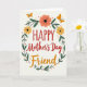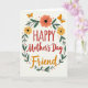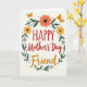This card features a soft, creamy background with a circular wreath of flowers and leaves that feels like a gentle hug between close friends ❤️. Around the border, verdant green leaves weave together with coral and marigold blossoms, each flower marked by a darker center for contrast. In the middle, the word “HAPPY” sits at the top in uppercase crimson letters, immediately catching the eye. Just below it, “Mother’s Day” appears in a flowing, calligraphy-style line in a matching red tone, adding a tender, handwritten feel. The word “Friend” is placed beneath in warm golden-orange lettering, like a quiet, affectionate note meant for someone special. Small coral and golden-yellow dots are sprinkled through the greenery, giving the wreath extra texture and a light, springtime energy 🌼. Two minimalist orange butterflies hover above the wreath near the top edge, their simple shapes floating over the flowers.