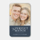 This wedding match design features a split layout with a warm, intimate photograph of two individuals smiling closely together on the top half. The bottom half showcases a solid dark blue background with elegant cursive and serif typography that reads "The Perfect Match." The color palette transitions from soft beige and light brown tones in the photo to deep navy blue, creating a romantic and contemporary aesthetic. The overall mood is cheerful and affectionate, making it ideal for celebrating a special relationship milestone.