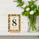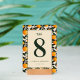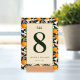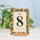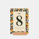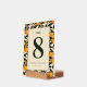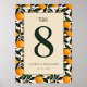 This wedding table card features a vibrant and elegant design with a central beige panel framed by a repeating pattern of orange fruits and green leaves. The color palette includes warm oranges, deep greens, and soft cream tones, creating a cheerful and inviting atmosphere. The layout is symmetrical, showcasing a bold serif number "8" at the top, followed by a cursive "table" script, enhancing its botanical elegance. Customizable placeholders for names and dates allow personalization, making it perfect for adding a touch of sophistication to your special day.