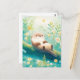 This bright and cheerful postcard features a happy little otter floating contentedly on a moss-covered log. The artwork is rendered in a refreshing watercolor style, highlighting a vibrant palette of mint green, turquoise, and soft yellow. Dainty white and yellow wildflowers sprout from the lush greenery, surrounded by an airy, sun-drenched atmosphere. With its soft textures and playful vibe, this piece captures the essence of a serene summer day by the water. This postcard is a wonderful choice for sending a sunny hello or a note of encouragement to a friend.
