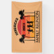 Announcement prop for a fun family reunion with family name and year of event, which needs to be personalized. Retro style with sunset, palm tree element, cheerful, jumping children.