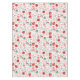 This table cloth features a cheerful holiday design with Santa, presents, pink Christmas trees and candy canes.