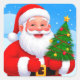 Vibrant cartoon Santa smiles warmly, holding a small decorated Christmas tree against a blue sky. Perfect for holiday greetings, family themes, and festive retail campaigns. Great for seasonal banners, social posts, and gift guides.