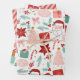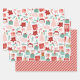 Three different cheerful patterns are included in this gift wrap set. The first is a fun mix of holiday icons: Santa, candy canes, gifts and pink Christmas trees on a bright white background. The second features presents wrapped up with pink, red, and green/teal and topped with bows. The third is a pink and red diagonal stripe pattern.