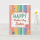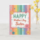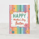 This card features a white rectangular message panel with a soft pink border, centered to draw the eye with a friendly, sisterly warmth ❤️. The text reads “HAPPY Mother’s Day Sister,” with “HAPPY” placed at the top in bright green letters and the rest set just beneath in red, flowing lettering. Around the panel sits a ring of tiny, multicolored button-like circles, some decorated with small floral prints that feel like little keepsakes shared between close family. Behind everything, vertical pastel stripes run from top to bottom in lavender, peach, golden yellow, soft green, and sky blue, creating a gentle rainbow backdrop 🌼. Decorative flowers in layered cutout style appear around the edges in pink, blue, and yellow, adding depth like a bouquet arranged with care. A stylized orange sunburst or citrus-slice shape stands out as a cheerful accent, echoed by smaller starburst shapes and extra button details scattered nearby. The overall layout keeps the message centered while the colorful decorations cluster around it, including a few floral buttons tucked near the corners of the pink-framed panel. The background stripes remain evenly spaced, with the pastel colors alternating in narrow vertical bands behind the central white panel.