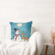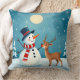 A happy snowman with a red scarf and a friendly reindeer stand amidst snowy trees and falling snowflakes, illuminated by a glowing wintery moon. A festive scene evoking warmth and joy.