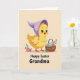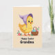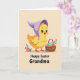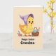 This card features a cheerful, stylized little bird in sunlit yellow, wearing a soft lavender bonnet tied neatly with a matching tassel. Its large dark eyes and gentle lashes lean into a friendly, affectionate look, paired with an open smile and a small orange beak. A light pink blush on its cheeks adds a tender, close-to-the-heart feel, like it’s sharing a quiet moment with someone special. The background is warm beige with a faint glow that keeps the scene soft and calm, and a woven basket of decorated eggs sits to the bird’s right like a thoughtful gift 🐰. The eggs show small patterns in blue, purple, and pink, adding detail without crowding the main character. Near the bottom, a few simple spring flowers in pink and green rest along the base, hinting at new-season cheer 🌷. The message appears below the illustration in dark, thick lettering, centered beneath the bird and basket.