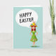 This card features a stylized young woman set against a pastel blue background, smiling with wide blue eyes and bright red hair that frames her face. She stands with hands on hips in a fresh green dress, and the tiny animal faces along the hem seem to “look up” at her like friendly companions, adding a sweet, close-knit feel. A wide-brimmed yellow hat sits atop her head, decorated with small blue and pink flowers 🌷. From inside the hat’s crown, a small long-eared creature peeks out 🐰, as if sharing a private joke with the viewer. Near the top, a soft white thought bubble with gentle shading holds the greeting text in a thick, handwritten-style look. The words sit centered inside the bubble, in dark lettering that stands out clearly against the pale fill. The overall scene is brightly lit, and the hat’s flower accents show tiny blue petals and soft pink buds around the brim.