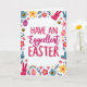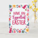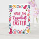 This card features a bright spring illustration with the phrase “HAVE AN Eggcellent EASTER” centered on a white background, with “HAVE AN” and “EASTER” in a strong, simple type and “Eggcellent” in a flowing, cursive-style look. The main text is set in vivid magenta, standing out clearly and giving the layout an upbeat, friendly feel. Around the message, a detailed border wraps the edges like a garden frame, mixing soft pinks, sunny yellows, light blues, and leafy greens with a few deeper red and teal accents. Round-eared bunny-like characters and other small critters peek from the border, their gentle smiles and close-together placement suggesting a sweet, companionable moment 🐰. Stylized flowers and sprigs of foliage fill the spaces between them, adding a light, breezy springtime setting 🌷. Small striped winged insects drift through the design, each drawn with a simple face that makes the scene feel welcoming. Along the outer edge, decorated egg shapes with stripes, stars, and tiny blossoms appear beside a small rainbow and a single blue boot.