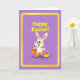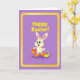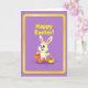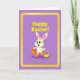 This card features a golden frame around a lavender background, with sunny yellow text placed prominently near the top. In the center, a white bunny with soft cream shading stands in a jaunty pose 🐰, one foot lifted as if stepping closer to a friend. Its tall ears show pink at the tips, matching a small pink nose, and bright blue eyes look outward with an open smile. The bunny wears bright orange boots and raises a small empty basket, angled upward like it’s ready to share treats. To one side sits a larger yellow basket filled with patterned eggs in several colors, adding a cozy, together-time feel 🌷. Confetti-like pieces in red, blue, and yellow scatter around the bunny’s feet, and the lighting stays flat and bright for a cheerful, animated look. The golden border remains thin and shiny, enclosing the scene while the yellow headline text stands out clearly against the lavender field.