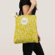 A cheerful whimsical yellow and white curvy doodle pattern covers this stylish tote with bright colorful style. A round frame at the upper part of the design has a text template to personalize with your monogram initial and name.