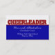 Great looking business card, designed for cheerleaders or coaches. Bold red text reads CHEERLEADER, on top of the card, with a solid blue text area, on the bottom and on the back, allows you to personalize with all your information. Available in many color choices, check out Dizzy Debbie for more cheerleader products.