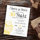 Casual funny cheers and beers men thirty birthday party budget affordable invitation card with a fancy typography script, a yellow doodle beer mug, and vintage style swirls. +++++++++++++ Suitable for any age or milestone birthday party. Easy to personalize by changing age, name, and party details! ++++++++++ PLEASE READ THIS BEFORE PURCHASING! This is a budget affordable wedding card printed on a paper sheet (each sheet has one card). ++++ For the best rapport price-quality, our advice is to choose the Semi-Gloss paper type (it is thick enough to be used for stationery) ++++ If you need envelopes, choose the ENVELOPE OPTION. +++ Double-check all the information and spelling of your text because you will receive exactly what you see - no one else will check anything before printing. ++++ This card is designed for size 4.5" x 5.6". In the case you choose another size of the card and text goes outside page, everything needs to be fixed before adding the product to cart. Please ask Live Design Service for help.