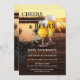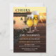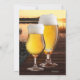 Bachelor party invitation featuring a sunset at a lake with two beer glasses at a jetty. On the back side you can choose whether you would like to display a dark wood background or a larger image of the glasses. Beautiful for an outdoor celebration, pub crawl or a BBQ.