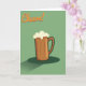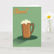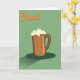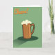 This card shows a sturdy beer mug centered on a muted sage green background, filled with amber beer and topped with a thick cap of creamy foam that looks ready to spill over. The mug is drawn in warm brown tones with subtle vertical shading lines, and its dark outline and rounded handle give it a cozy, companionable presence, like something you’d raise toward a friend with a knowing smile 💚. Above the mug, the word “Cheers!” curves across the upper left in bright orange lettering, finished with an exclamation mark that leans into the toast. The limited palette of greens, oranges, and browns keeps the scene simple while still feeling festive, with a retro poster-like look. A darker emerald oval shadow sits directly under the mug, anchoring it and hinting at light coming from the upper right. The foam is drawn in soft, scalloped layers, contrasting with the mug’s straighter edges and making the drink look extra inviting ☘️. The background stays flat and uncluttered, so your eye goes straight from the orange “Cheers!” down to the amber glass and the deep green shadow beneath it.