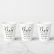 Wedding paper party cups feature chic black script "Cheers" text with arrow monogram design that can be personalized with the bride and groom names and wedding date.