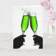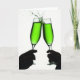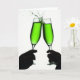 This card shows two champagne flutes meeting mid-toast, held by dark, shadowed hands against a bright white background, as if the couple is leaning in close for a shared laugh. The glasses glow with an intense emerald-green drink 💚, and the backlight makes the bubbles shimmer up the sides. At the moment they touch, the green liquid bursts upward in a dramatic splash, suggesting a flirty, can’t-help-it kind of celebration between friends or sweethearts. Tiny droplets scatter in the air like glittering beads, each one sharply defined against the pale space around it. The contrast between the inky hands and the luminous drink pulls your eye straight to the toast, where the closeness of the hands hints at an easy connection. “Happy St. Patrick’s Day” sits near the top in green lettering, with a small ☘️ tucked beside the words. Below, the white background stays open and uncluttered, framing the bright splash and the suspended droplets around the touching rims.