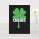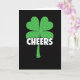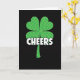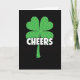 This card features a glowing lime-green four-leaf clover centered on a deep black background, with each heart-shaped leaf sprinkled in darker emerald polka dots for extra texture. Across the clover, the word “CHEERS” stretches diagonally upward in crisp white letters edged with a thin dark outline, giving it a lifted look. The high contrast makes the green feel like it’s shining, like a shared toast in a dim room where friends lean in close. The heart-shaped leaves add a quiet romantic touch, as if the clover is made of four little hearts gathered together under one word. The dotted pattern softens the sharp contrast and keeps the scene feeling friendly and inviting 💚. With so little else on the front, your eye stays on the clover and the angled lettering, like a simple sign passed between two people who know exactly what it means ☘️. The clover’s four lobes sit evenly around the center, bright against the black, with the dots scattered like tiny shadows across the green.