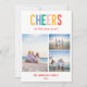 Colorful CHEERS, New Year's photo card. Features, 3 photo center collage design, template lines for your name and year with coordinating coral and white abstract shape pattern backing.
