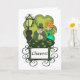 Cheers! for St. Patrick's Day, paper greeting card with a couple drinking beer in a pub / bar setting. Whimsical scene with lots of green, festive Irish costumes, and big mugs of beer. A table covered with shamrocks and a light / lamp with curving lines and additional flourishes adds to the whimsical scene. Clip art thanks to:Openclipart. Art, image, and verse © Shoaff Ballanger Studios.