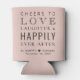 Give your wedding guests, bridal party and groomsmen a fun custom keepsake souvenir of your special day. This blush pink can cooler wedding favor features "Cheers to Love Laughter & Happily Ever After Party" in a mix of modern and elegant typographies, your first names and wedding date.