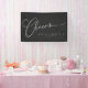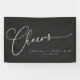 This wedding banner features an oversized white calligraphy "Cheers" script on a deep black background, with the couple's names and wedding date in spaced modern lettering below. The high-contrast, moody design is a natural fit for a modern wedding reception, bar area, or photo op wall. Couple names and date are fully editable to personalize it for your celebration. A striking backdrop that works beautifully in photos and sets a sophisticated tone for the whole event.