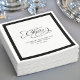 Celebrate in style with these elegantly minimalist cocktail napkins, featuring a graceful “Cheers” in calligraphy, followed by “Celebrate with the new Mr & Mrs. custom name” spread beautifully across two lines and a sleek modern formatted date. The crisp white background and black typography strike the perfect balance between timeless charm and modern refinement. Featuring a sophisticated black border and solid black back completes the clean aesthetic.