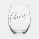 This is a minimalist customised black white typography cheers stemless wine glass specially design for your wedding party.