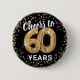 Trendy black and gold sixtieth birthday button featuring a black background that can be changed to any color, sixty gold hellium balloons, elegant gold glitter, and the saying "cheers to 60 years".