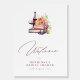 Cheers to a New Chapter Wine & Books Bridal Shower welcome board with a watercolor composition of a wine bottle, glass, books and flowers. "Cheers" is in masala/burgundy modern hand lettering.