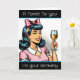 Happy Birthday card. Cheers to celebrating you! Pretty retro lady holding up a glass of wine. Pop art comic book style art.