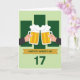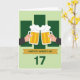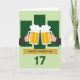 This card shows two raised hands clinking beer mugs in the middle of the scene, their fingers angled toward each other like close friends leaning in for a shared toast 💚. Each mug is filled with golden ale, topped with thick white foam that spills upward in rounded shapes, adding a cozy, celebratory touch. Behind the mugs, deep emerald rectangles rise like a simple backdrop, while a softer lime-green field wraps around everything for a fresh St. Patrick’s Day setting ☘️. The close spacing of the mugs and the mirrored tilt of the wrists suggest an easy bond, like a familiar cheers between people who know each other well. Below the clink, a gold banner stretches across the lower area with the words “HAPPY ST. PATRICK’S DAY” set in dark green, all caps lettering. Under that banner, a large “17” sits centered in dark green, giving the layout a clear date marker. The overall look stays flat and minimal, with strong green shapes framing the warm amber drinks and the bright white foam. Deep emerald panels sit behind the mugs, and the lime-green background fills the remaining space around the gold banner and the dark green “17.”