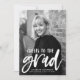 Stylish, modern graduation announcements featuring the graduate's vertical photo with "Cheers to the grad" in a white, hand-lettered brush script. Personalize the front of the announcement by adding the graduate's name, school name, and graduation year. The photo graduation announcement reverses to display a red and white abstract dot pattern.