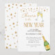 New Year's eve party invitation featuring hand painted watercolor champagne flutes and champagne bottle with gold star confetti.