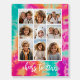 Unconventional Holiday and New Year design with a 70s vibe. Funky fonts and type plus a tie-dye accent. 9 Photo collage in the shape of a grid. "Cheers to the New Year" is in a modern font that coordinates with the non-traditional background. Retro Tie Dye Pattern in a mixture of hot pink, orange and teal. If you need to move anything around, click on the customize button to make changes.