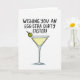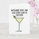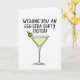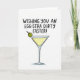 This card shows a tall stemmed glass centered on a white background, filled with a pale golden drink that glows softly. A single round green garnish rests on the rim, adding a flirty little accent like a wink shared between close friends. Above the illustration, a witty seasonal greeting sits across the upper half in thick black, hand-drawn lettering with rounded shapes. The words are spaced loosely so the message feels breezy, and the dark ink contrasts sharply against the open white space. The simple layout keeps the focus on the drink and the cheeky line, with a hint of romance in the way the garnish perches as if leaning in. A small 🌷 or 🐇 detail can be added near the text area to nod to the season without crowding the design. Beneath the glass, a faint pale-blue shadow pools lightly, and the black outlines have tiny natural wobbles that make the drawing feel relaxed.