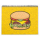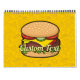 Cheeseburger cartoon illustration. Junk food outline icons yellow pattern background. Custom text.