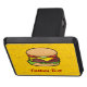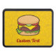 Cheeseburger cartoon illustration. Junk food outline icons yellow pattern background. Custom text.