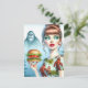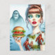 A woman in a Sasquatch print shirt holds a cheeseburger in the forest as Sasquatch watches her AI generated art
