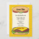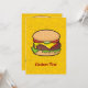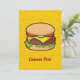 Cheeseburger cartoon illustration. Junk food outline icons yellow pattern background. Custom text.